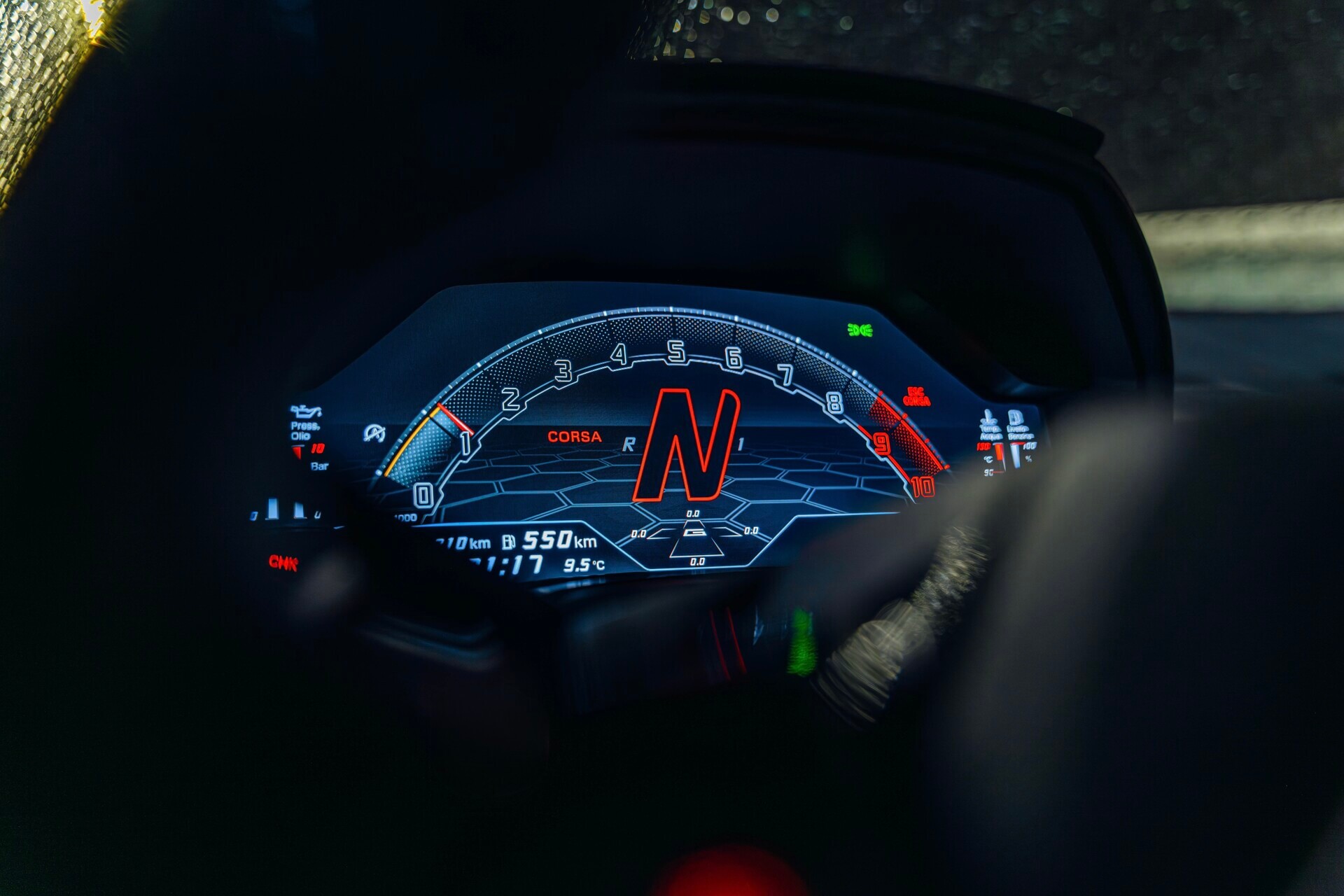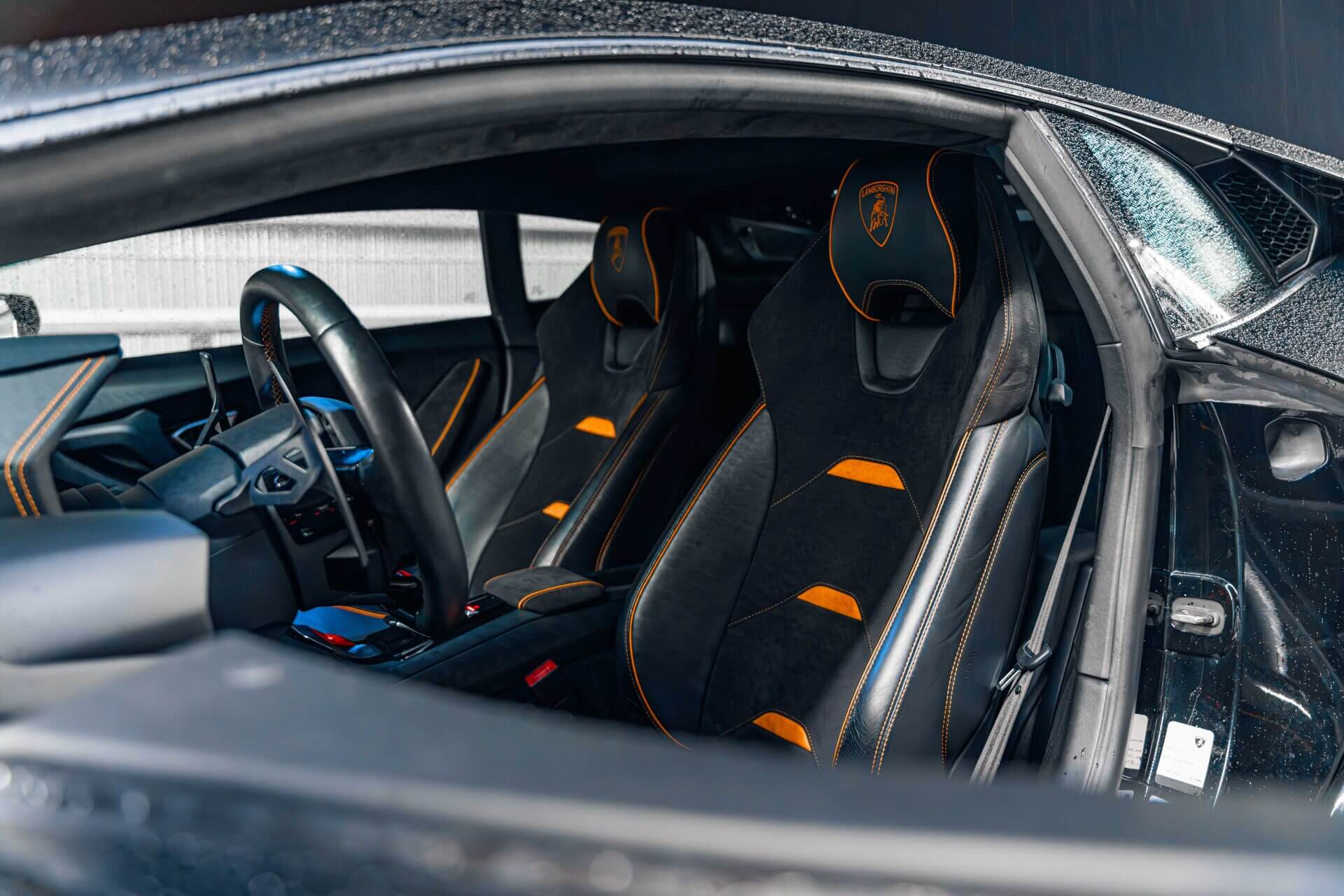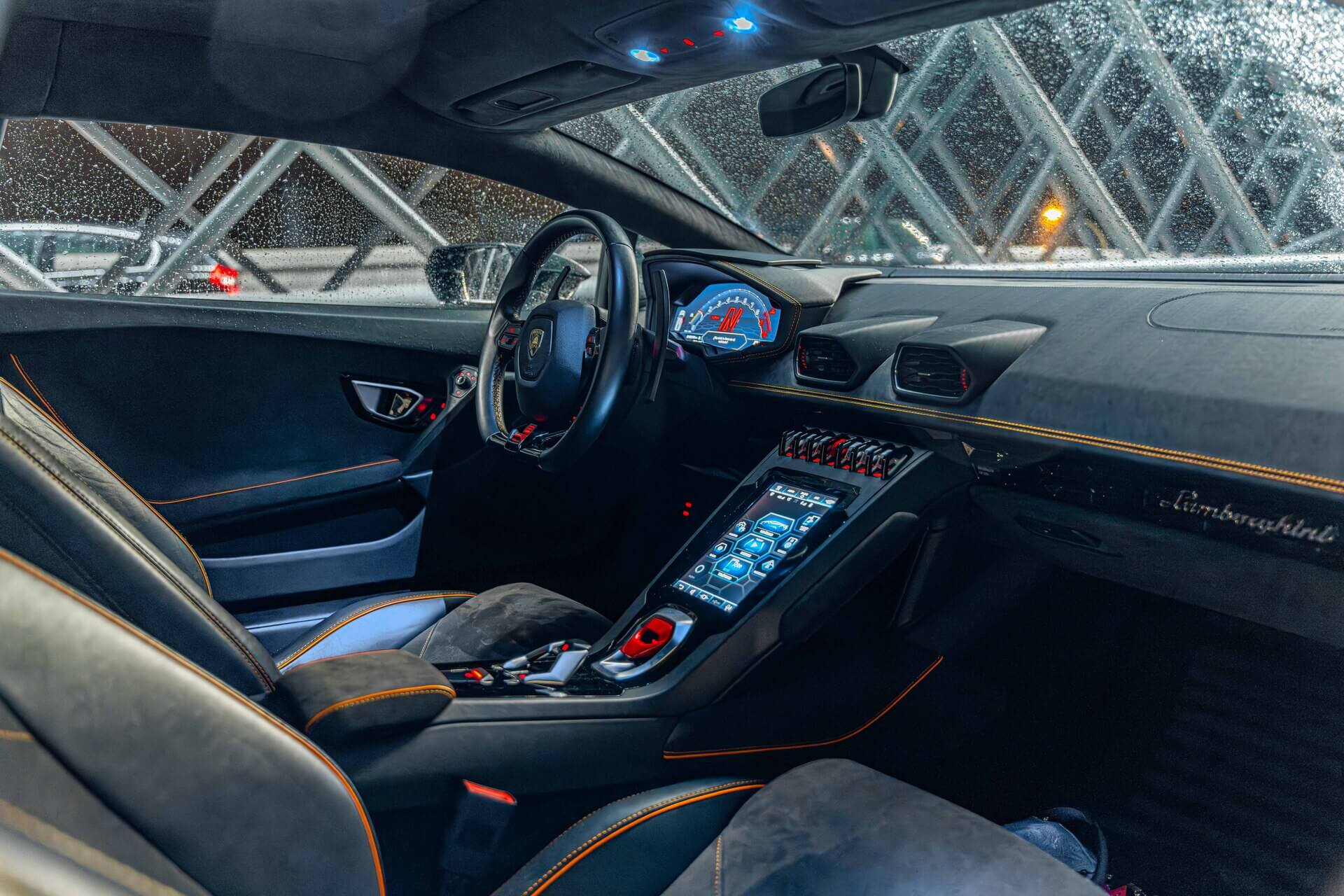 El interior del Huracan EVO está centrado en el conductor, con un diseño futurista y materiales de alta calidad como Alcántara, fibra de carbono y cuero premium.